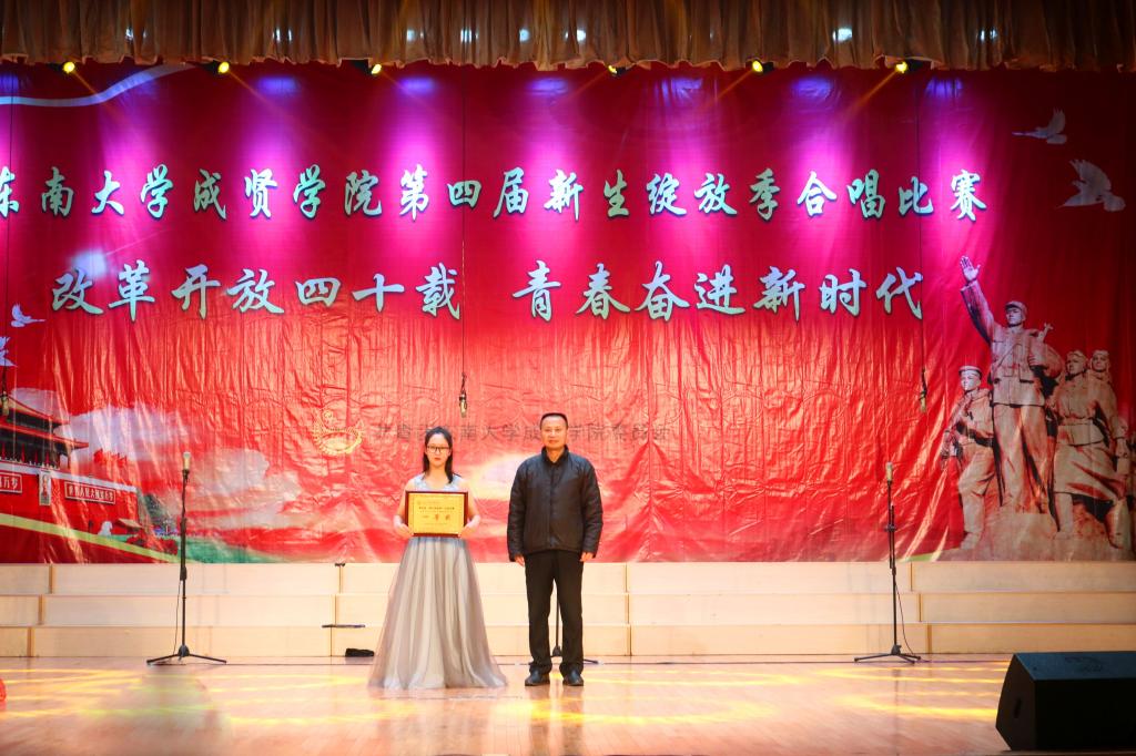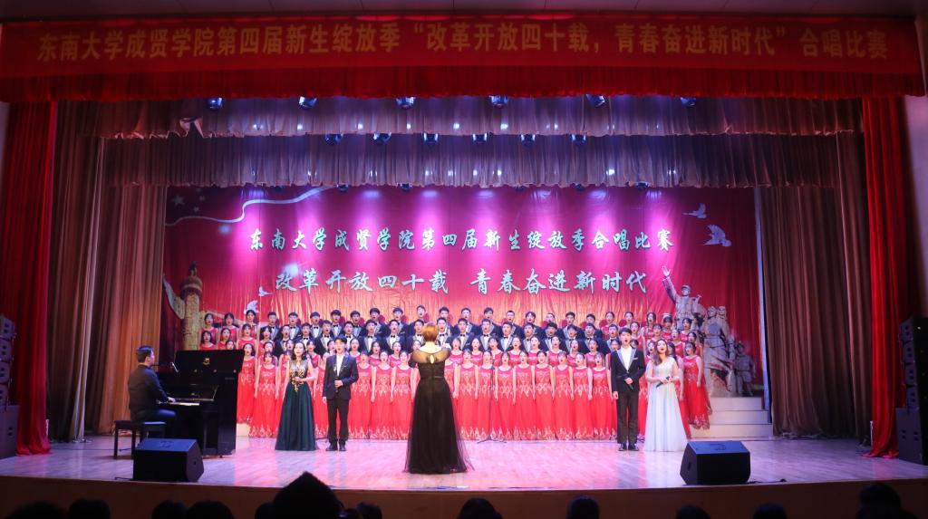 比赛中,大学生艺术指导中心音乐团倾情演绎歌曲《望春风》,展现了经典民谣的优美旋律;各海角社区老师积极参与指导与演出,师生们通力合作,用铿锵有力、激昂向上的歌声引发了观众对改革开放四十周年来伟大变革的共鸣,充分表达出成贤学子更加坚定走中国特色社会主义道路、改革开放道路的信心与决心。比赛在全场齐唱雄壮的《东南大学校歌》声中圆满结束。