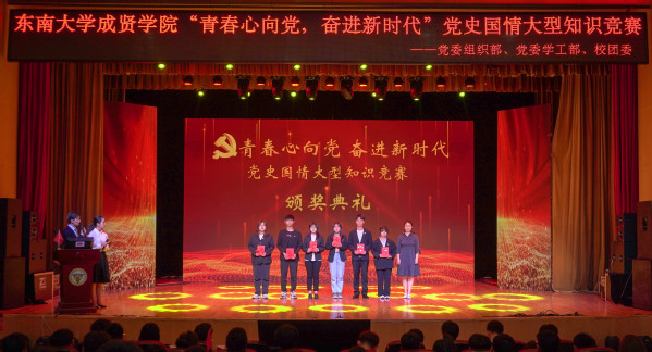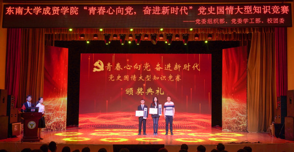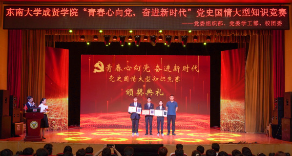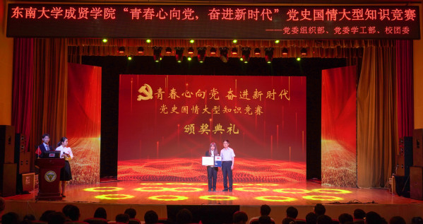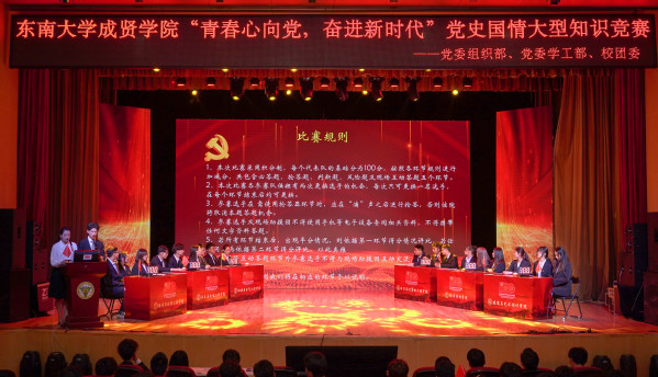 为庆祝中国共产党成立100周年,深入贯彻习近平总书记在党史教育动员大会上的重要讲话精神,落实学校党委关于党史学习教育的决策部署,5月9日晚,由学校党委组织部、党委学工部、校团委联合主办,校学生会学习部承办的“青春心向党,奋进新时代”党史国情知识竞赛在综合楼报告厅举行。党委学工部部长、学生处处长施杰,校团委书记、人武部部长潘明烽,机械与电气工程海角社区综合办主任李洪全,制药与化学工程海角社区综合办主任刘静,海角社区部分分团委书记、辅导员老师与近600名学生代表共同参加了比赛。