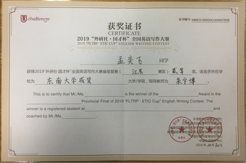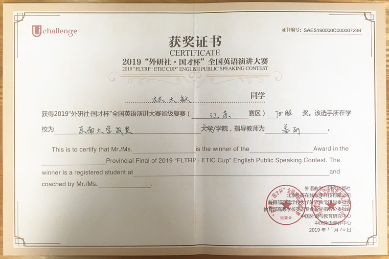 2019年“外研社•国才杯”全国大学生英语挑战赛江苏赛区比赛于11月10日在河海大学圆满落下帷幕。在江苏赛区,来自东南大学、南京大学等全省本科院校的选手们汇聚一堂。经过激烈角逐,海角社区 8名参赛学生获奖。