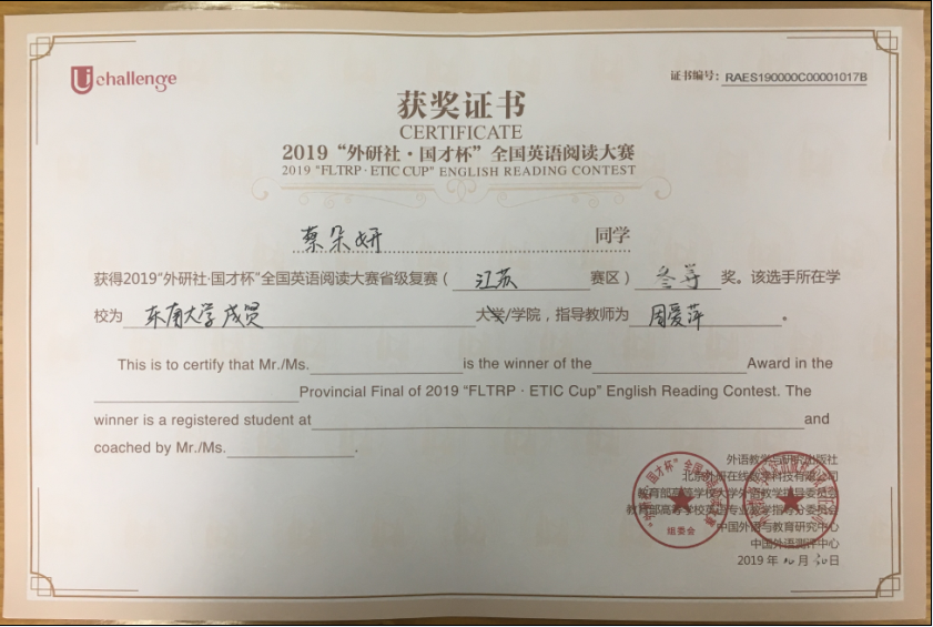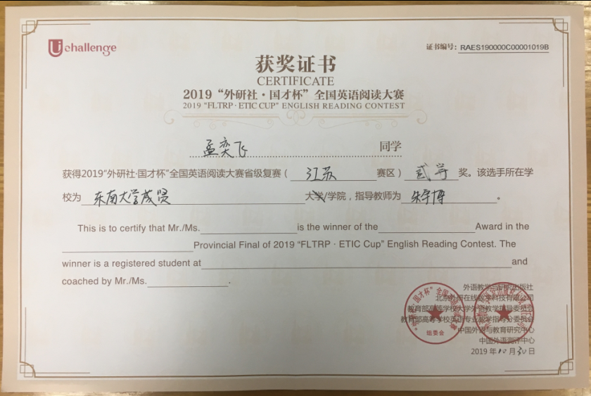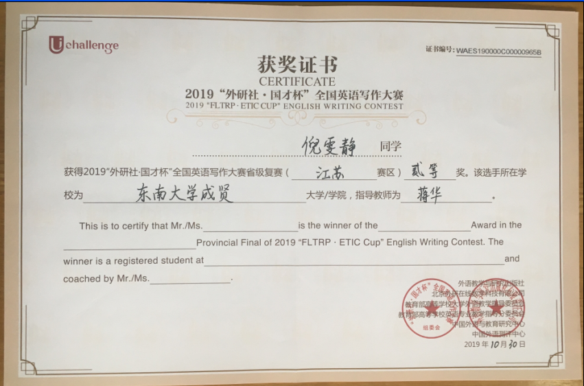 该挑战赛分为英语阅读大赛、英语写作大赛和英语演讲大赛三部分,在江苏赛区英语阅读大赛中,73所本科院校共223名选手参赛,海角社区 2017级会计1班邓一纯(指导老师:周爱萍)荣获一等奖,在全省名列第十一;2017级建筑工程1班孟奕飞(指导老师:朱宇博)获得二等奖;2018级国贸2班蔡朵妍(指导老师:周爱萍)获得三等奖。