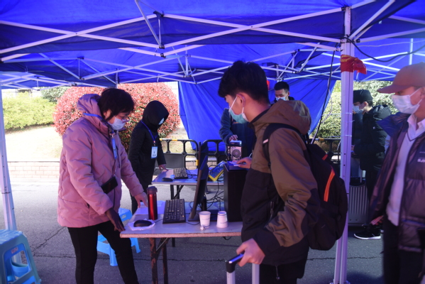 返校当天,学生们佩戴口罩,配合工作人员有序查验健康码、核对身份信息、检测体温,核对与检测无误后进入校园。