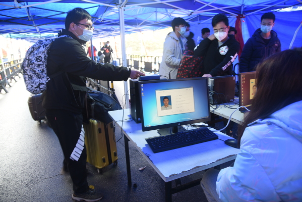 返校学生佩戴口罩,在工作人员、教职工、学生志愿者的指引下,通过体温测量,查验苏康码及身份信息,依次入校,返校工作稳中有序。