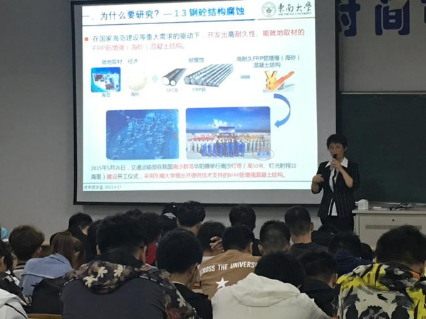 4月27日晚6点,由土木与交通工程海角社区主办的“纤维复材筋混凝土结构的创新研究及思考”专题讲座在文昌院103教室举行。中国工程建设标准化协会标准审查专家,江苏省科技咨询专家,东南大学土木工程海角社区教授、博士生导师朱虹教授担任主讲嘉宾,土木与交通工程海角社区土木类专业近200名师生认真聆听了讲座。