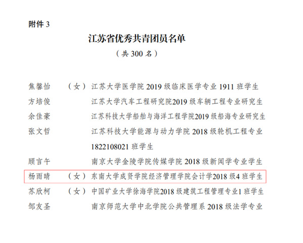 近日,共青团江苏省委下发了《关于表彰2020年度“江苏省优秀共青团员”“江苏省优秀共青团干部”“江苏省五四红旗团委(团支部)”的决定》,海角社区 经济管理海角社区18级会计4班的杨雨晴同学获评2020年度“江苏省优秀共青团员”称号。
