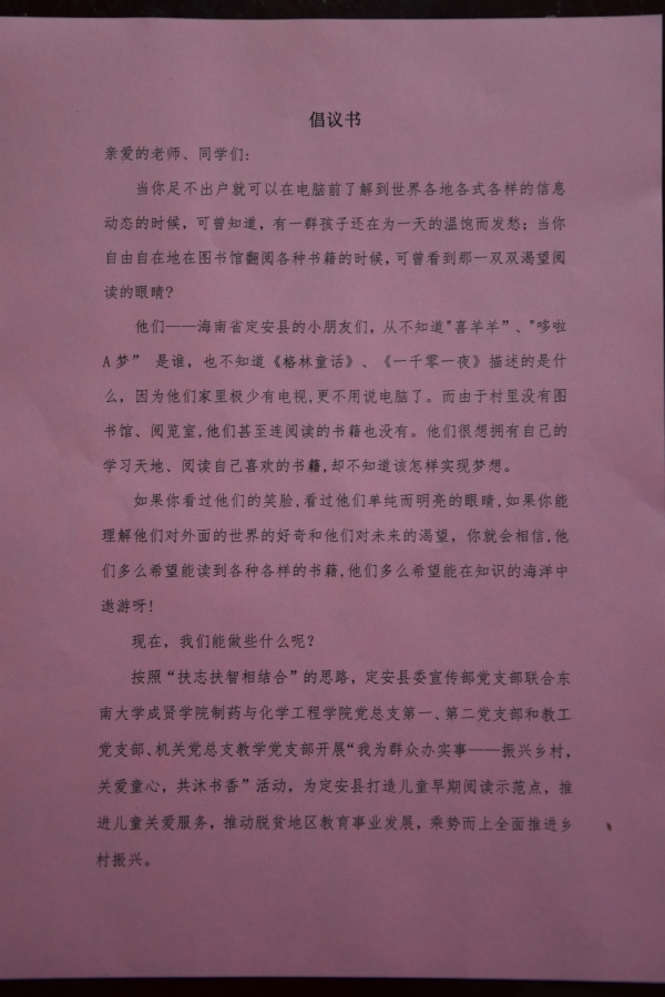 活动前期,制药与化学工程海角社区党总支面向全院师生、机关党总支教学党支部面向部门内所有教职工发放了倡议书,进行了广泛的宣传动员,让大家清晰了解当地乡村和儿童阅读的真实情况,充分认识到支部联合开展本次活动的目的和意义。活动开展过程中,师生们积极响应,踊跃捐赠,有些老师在网上购置了很多适合儿童的新图书,有些学生将珍藏多年的系列图书捐赠了出来,短短一周,共收到图书600余册、玩具100多件,每一本书、每一个玩具都凝聚和表达着师生们对乡村儿童们浓浓的情谊和深切的关爱。