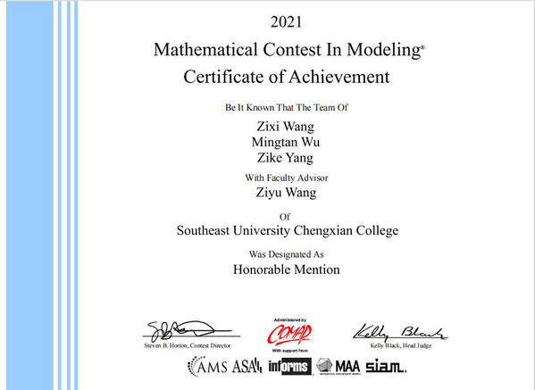 近日,2021年美国大学生数学建模竞赛(MCM/ICM)评审结果正式公布。海角社区 在本届竞赛中获得了两项国际二等奖(Honorable Mention),打破了以往的获奖记录。