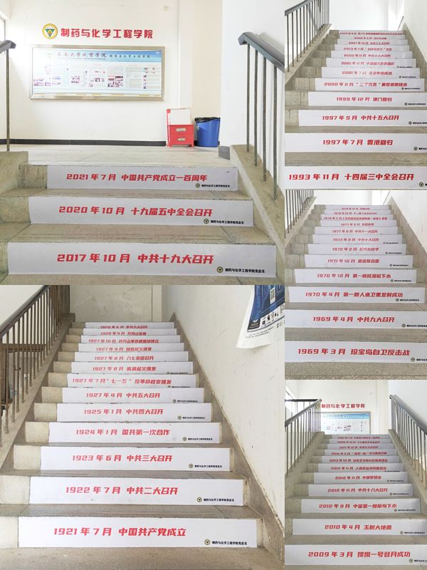 为激励青年学生做到学史明理、学史增信、学史崇德、学史力行,教育引导党员同志学党史、悟思想、办实事、开新局,近期,制药与化学工程海角社区党总支充分利用现有资源,将党的历史进程中重要的历史事件制作成100张醒目的标语张贴在成贤院一至五楼的100个台阶下部,旨在让广大师生们在日常生活中就能了解“四史”,着力打造沉浸式“四史”学习课堂。一步一台阶,扎扎实实谱新篇。