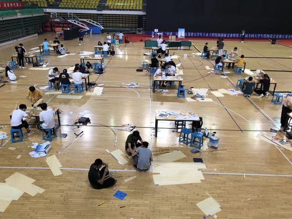 大学生结构设计竞赛是土木工程领域级别最高、规模最大的学生创新竞赛活动,被誉为“土木皇冠上最璀璨的明珠”。竞赛自确立以来一直以“创造、协作和实践”为宗旨。本次竞赛模型加载组分为三级加载,第一级模拟桥梁随机分布荷载,第二级模拟桥梁严重偏载,第三级用5kg滚动小球模拟移动荷载。比赛要求学生在现场16个小时内设计、制作一座桥梁,桥梁能否勇闯三关,且保持较轻的质量,决定其能否得到高分。