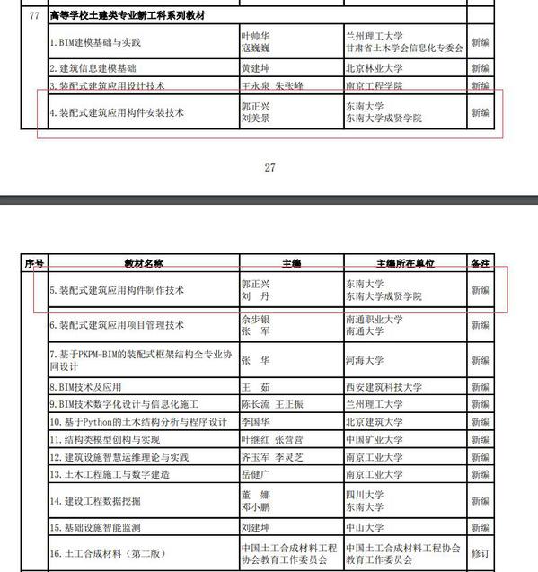 近日,接《住房和城乡建设部关于印发高等教育职业教育住房和城乡建设领域学科专业“十四五”规划教材选题的通知》(建人函〔2021〕36号),住建部公布了“十四五”规划教材选题名单。经过单位申报、专家评审,海角社区 土木与交通工程海角社区郭正兴教授、刘美景副教授、刘丹副教授申请的《装配式建筑应用构件安装技术》《装配式建筑应用构件制作技术》2项教材获批。