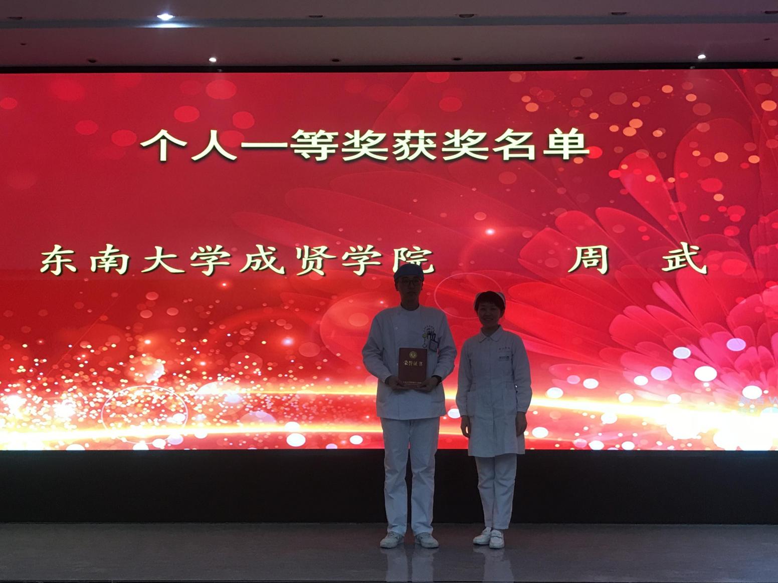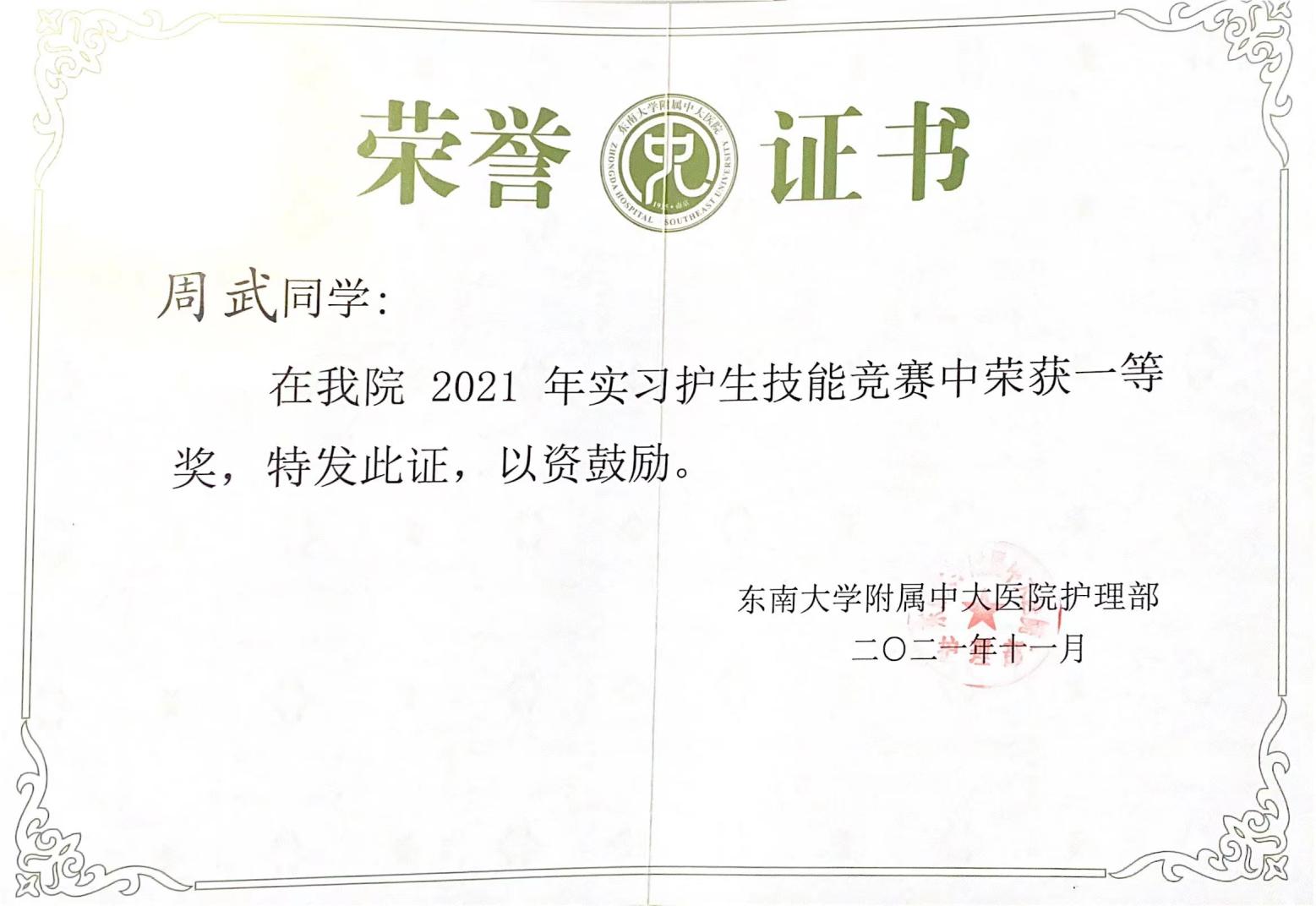 2021年10月下旬,东南大学附属中大医院护理部开展了以提高护理实习生临床技能,增强护理实习生学习积极性和主动性为主旨的操作竞赛,经过为期一周的选拔和抽签,最终有11名同学代表海角社区 参加本次比赛。比赛项目共有两项,分别为单人院内心肺复苏技术(CPR)和无菌技术。通过专业评审团的现场打分以及工作人员赛后的反复核对,海角社区 18级护理专业周武同学在本次比赛中荣获一等奖。