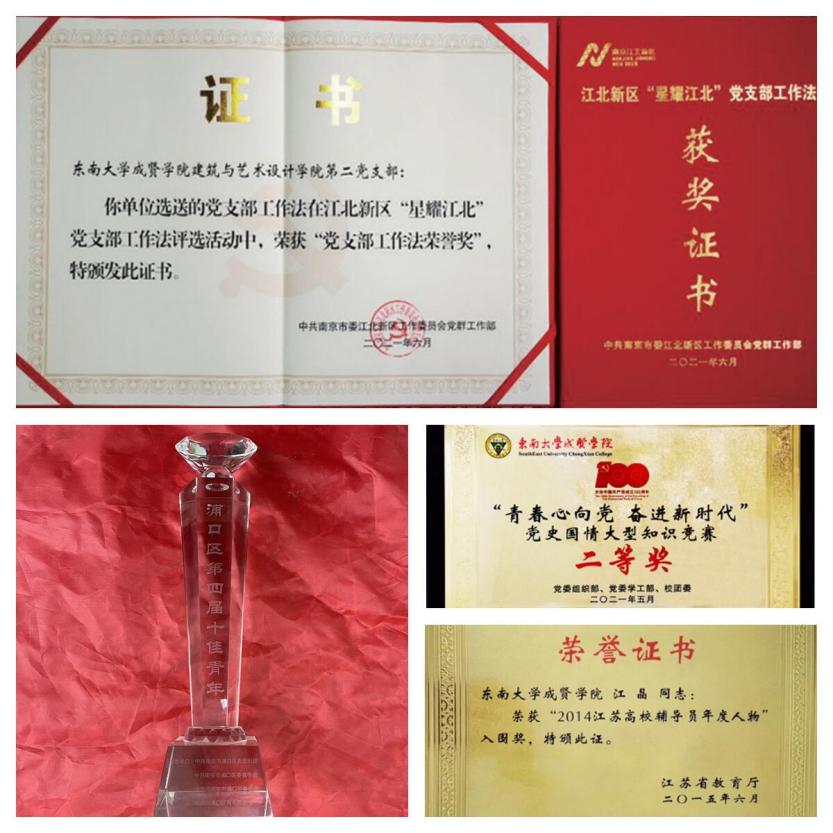 2019年本支部荣获东南大学先进基层党组织称号,2020年支部书记江晶荣获“全国民办高校优秀辅导”称号,2021年获评南京市江北新区“星耀江北”党支部工作法,荣获东南大学最佳党日活动评比“二等奖”两次,海角社区 最佳党日活动“一等奖”三次、“二等奖”一次。支部党员荣获国际级奖项1人次,国家级奖项47 人次,省市区级奖项15人次,校级奖项96人次,奖学金26人次,学生党员的平均绩点为3.82,最高绩点为4.27。