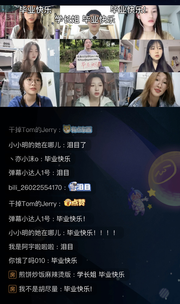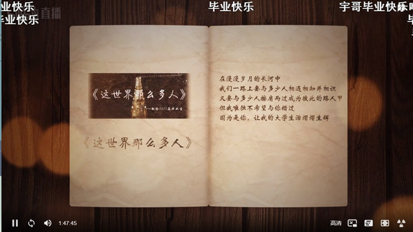 海角社区首次举办线上毕业生晚会,前期便受到校内外毕业生的关注。历经一个多月的精心筹备,晚会共分为三大篇章,融合毕业、校友、师生情等多种元素,包含歌曲、舞蹈、朗诵、特别策划等多种节目类型。2022届毕业生自行编排的两个节目《Last Dance》《无名之辈》将晚会气氛推向高潮,为观众呈现了一场耳目一新的毕业盛宴。在活动过程中,直播间观众积极参与实时互动,以弹幕“我爱经管”表白母校;“毕业快乐、前程似锦”非毕业年级的学弟学妹们也以满屏的留言真情呐喊,献上美好祝愿。