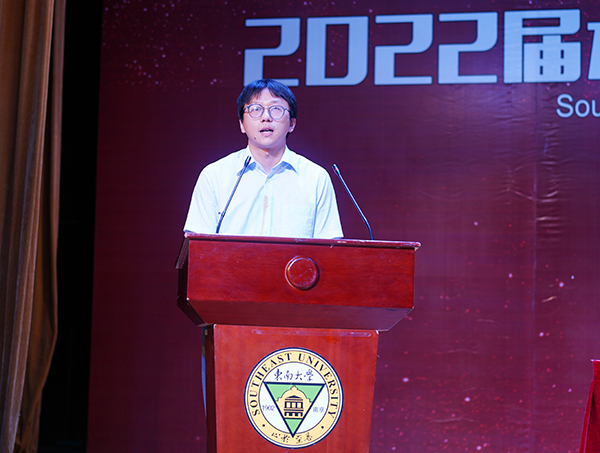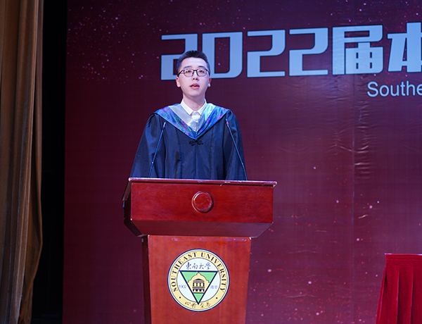 护理学2班周武作为毕业生代表表达了对校园的热爱、对师长的感激、对母校的祝福。即将踏入东南大学继续进行学术研究的他勉励大家:在今后的学习工作生涯中要满怀感恩,将心比心;充满敬畏,谨慎细心;勇敢坚毅,保持恒心;不负热爱,不忘初心。