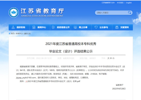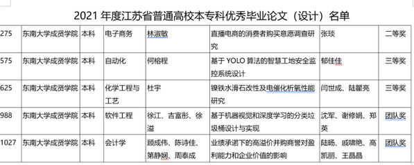 近日,江苏省教育厅发布《2021年江苏省普通高校本专科优秀毕业设计(论文)评选结果公示》,东南大学成贤海角社区共获优秀毕业设计个人二等奖1个、三等奖2个、优秀毕业设计团队奖2个。
