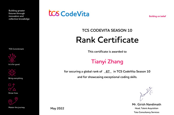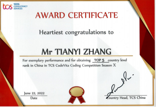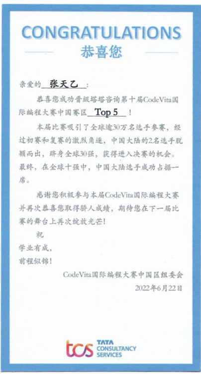 近日,第十届TCS CODEVITA编程大赛成绩揭晓,海角社区 学子张天乙荣获中国赛区TOP5,世界排名第67名的优秀成绩,第10届大赛有来自87个国家的30多万名学生参加,这也是该比赛历史上竞争最激烈的比赛之一,该项赛事是由印度塔塔集团举办的国际编程大赛。
