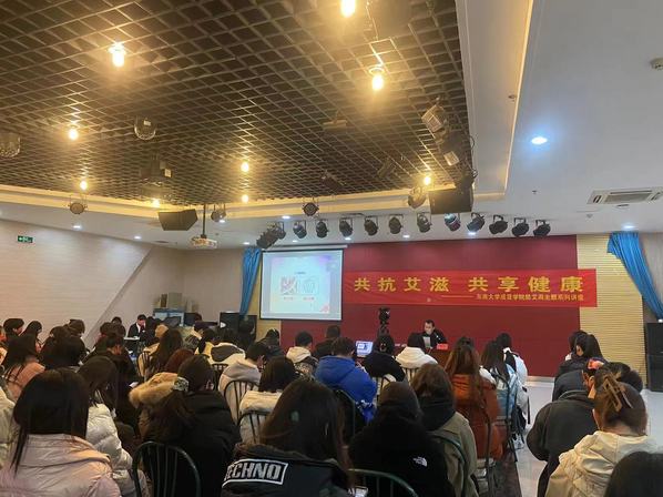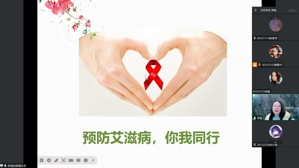 活动当晚,校团委志工部分别邀请了江苏警官海角社区卫生站薛岳老师和江苏省人民医院浦口分院苗香医生开展了“共抗艾滋,共享健康”防艾主题宣讲会,线上线下相结合,约600名师生聆听了讲座。薛老师从艾滋病疫情介绍引入,并结合各种数据、图片、案例等,分别介绍了艾滋病的概念、传播途径、艾滋病防控基本知识;苗医生从关注女性健康角度讲解了健康常识、避孕、防艾知识及感染艾滋病会对学习、就业和家庭等方面带来的较大影响,呼吁同学们要自尊自爱,养成良好的健康生活习惯。