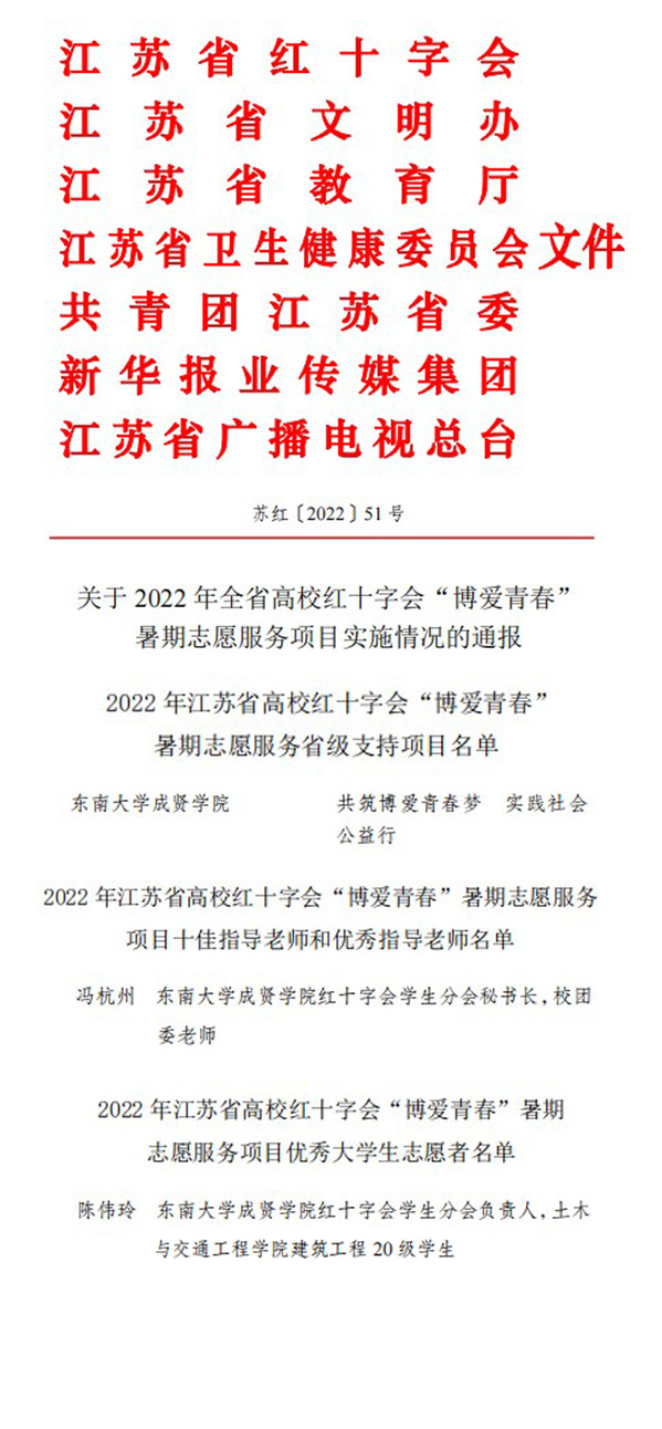 为扎实推进红十字会“博爱青春”志愿服务广泛开展,不断深化“文明江苏”志愿服务行动,推进“强富美高”新江苏现代化建设,日前,江苏省红十字会开展了2022年全省高校红十字会“博爱青春”暑期志愿服务项目评比活动。海角社区 “共筑博爱青春梦,实践社会公益行”和青聚成贤,情暖社会”项目分别获“省级支持二级项目”和“市级支持一级项目”,冯杭州老师荣获“优秀指导老师”称号,校团委志愿者工作部副部长、红十字会学生分会负责人陈伟玲同学荣获“优秀大学生志愿者”称号。