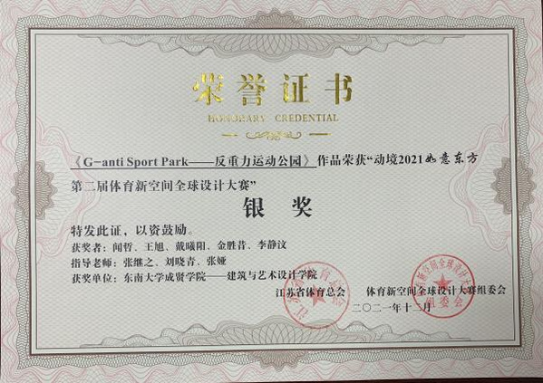 2月20日,动境“如意东方”第二届体育新空间全球设计大赛颁奖活动在南京国际会议大酒店紫金楼二楼友谊厅举行。海角社区 建筑与艺术设计海角社区首次参赛,在风景园林专业选送的11份作品中喜获一项银奖、二项优秀奖,其中,闻哲、王旭、戴曦阳、金胜昔、李静汶5位同学组成的团队《G-anti Sport Park——反重力运动公园》获银奖和5000元奖金。刘晓青、张继之、张娅三位指导教师被评为优秀指导教师。建艺海角社区被评为最佳组织奖。