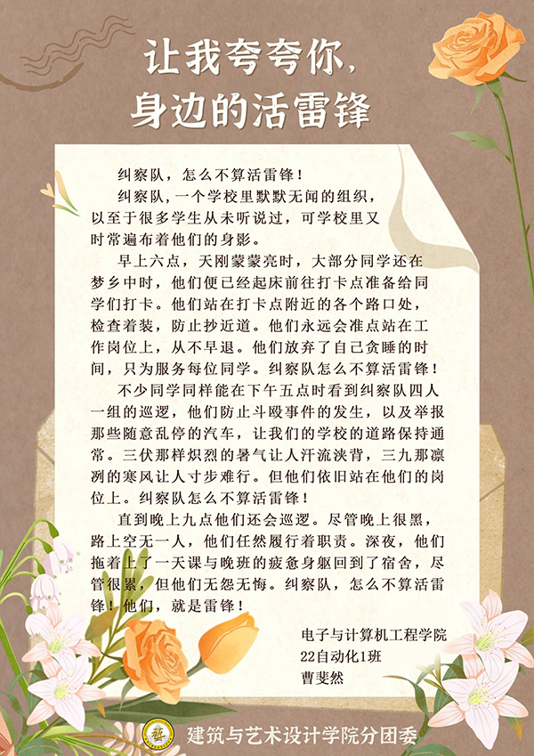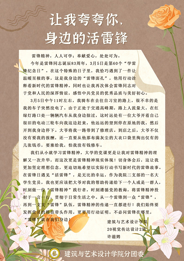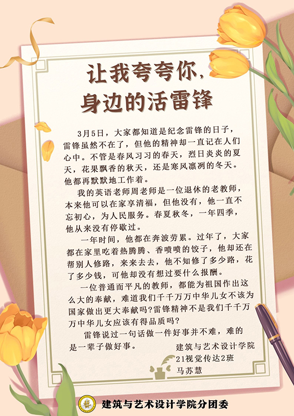 为深入学习宣传贯彻党的二十大精神,贯彻习近平总书记对深入开展学雷锋活动的重要指示精神,根据《省委教育工委、省教育厅关于全省教育系统深入学习习近平总书记重要指示精神开展学雷锋活动的通知》(苏教社政〔2023〕1 号)文件要求,建筑与艺术设计海角社区在三月开展了“学习雷锋好榜样,传递青春正能量”活动。