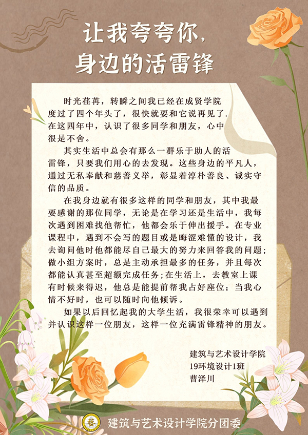 3月1日-5日,建筑与艺术设计海角社区分团委组织开展“让我夸夸你,身边活雷锋”学雷锋活动,通过“建艺之声”微信公众号进行全校征集,共收到179份感谢信。建筑与艺术设计海角社区分团委学生干部、第二党支部学生党员等担任志愿者,分类整理了每一封来信。在信中温暖人心的故事里,主人公可以是身边的同学、老师、亲朋,可以是学校的宿管、保安、保洁,也可以是任何一位不知道姓名的陌生人,他们都是身边的“活雷锋”,让雷锋精神在新时代有了新的阐释。