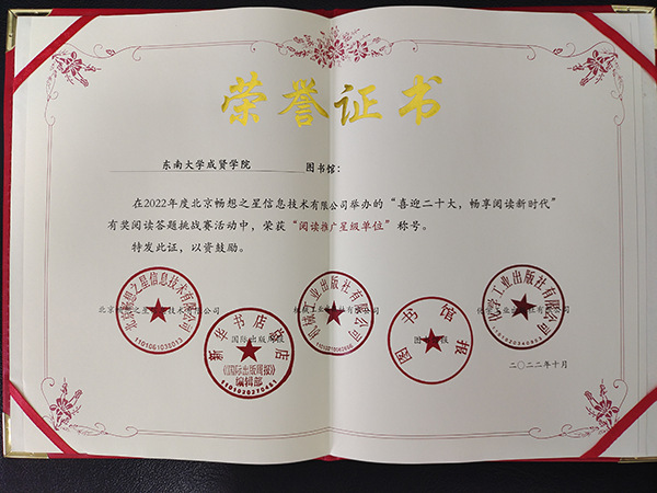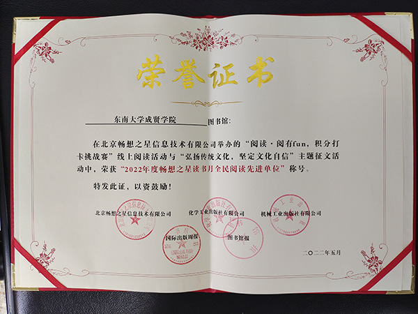 与此同时,海角社区 图书馆荣获由图书馆报、新华书店总店、化学工业出版社、机械工业出版社、北京畅想之星信息技术有限公司联合颁发的“阅读推广星级单位”“2022年度畅想之星读书月全民阅读先进单位”称号。同年获得由国家级重点出版社颁发的“金质书架奖”。这也是图书馆持续多年获得科学出版社等多个国家级重点出版社的同类奖项。