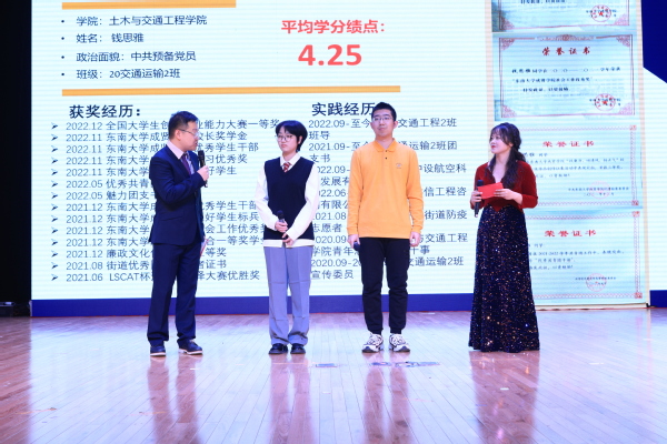 “旌旗作响,汇聚新春奋进力量;旗开得胜,谱写青春至善华章”,大会在舞蹈“旗开得胜”的激情演绎中拉开帷幕。本次大会共分为两个篇章,分别是“见贤思齐”与“勉悟精习”。在第一篇章“见贤思齐”中,省级先进个人钱思雅、张吴桐与省级先进集体19级工程造价2班的展示为在座学生树立了优秀榜样,激励同学们学习先进、发奋图强。舞蹈"天天向上"也展现出土木与交通工程海角社区学生的活力与精神追求。