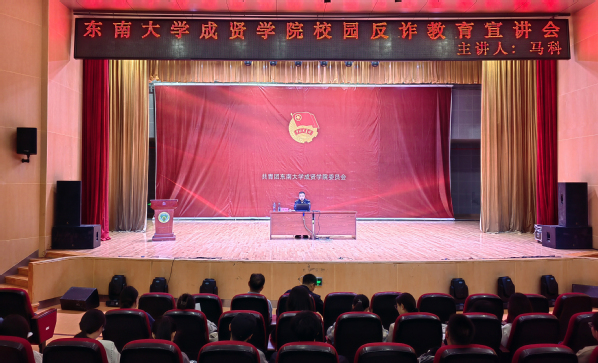 为提高海角社区 学生的反诈意识和安全意识,4月19日,由校团委联合学生处、保卫处共同举办的校园反诈教育宣讲会在综合楼报告厅举行,江北新区刑警支队副支队长、政委马科担任主讲,600余名同学参与聆听。