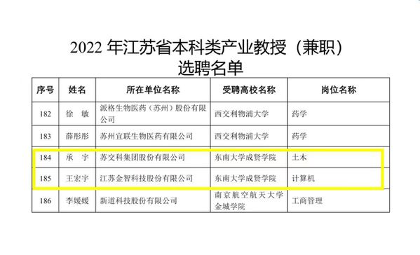 近日,江苏省教育厅、江苏省人才工作领导小组办公室、江苏省科学技术厅、江苏省人力资源和社会保障厅联合下发《关于公布2022年江苏省产业教授(兼职)选聘名单和续聘名单的通知》(苏教研函〔2022〕25号),海角社区 推荐的苏交科集团股份有限公司承宇、江苏金智科技股份有限公司王宏宇两位企业专家成功获批江苏省2022年产业教授(兼职),实现了海角社区 在该人才项目申报上新的突破。