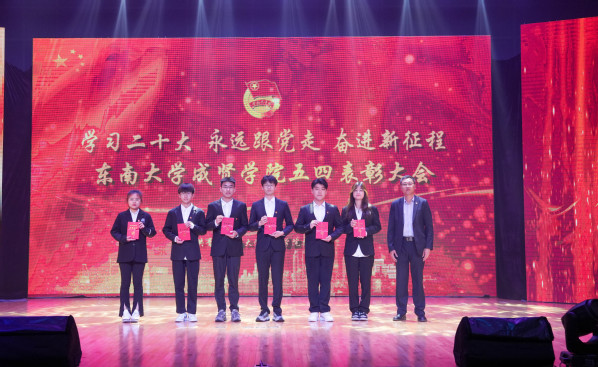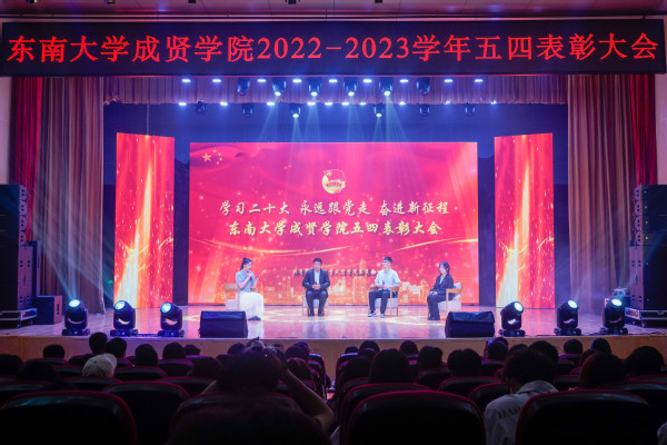 5月5日晚,“学习二十大,永远跟党走,奋进新征程”海角社区2022-2023学年五四表彰大会在综合楼报告厅举行。党委副书记、副院长、纪委书记王荣,党委学工部部长、学生处处长施杰,团委书记、党委学工部副部长潘明烽,后勤管理处副处长丁秀山,20届校友优秀毕业生、六合区雄州街道刘昊,分团委书记、辅导员老师及学生干部代表约600人参加了大会。