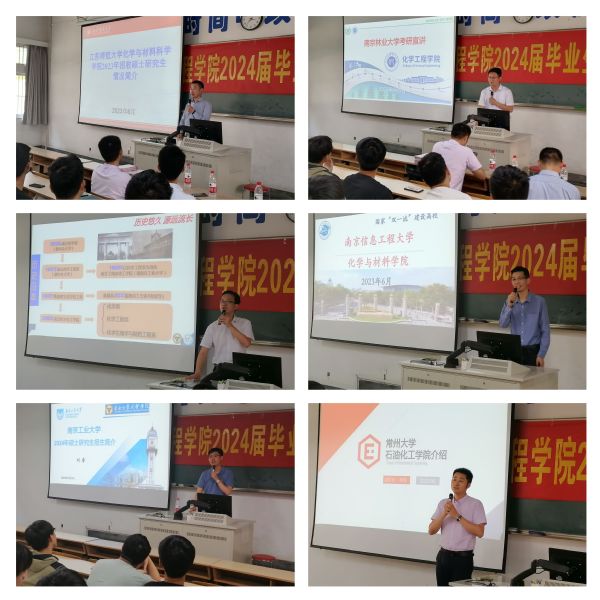 东南大学化学化工海角社区博士生导师张一卫教授、南京工业大学教务处副处长刘睿教授、常州大学石油化工海角社区副院长(江苏省双创人才)黄海教授、江苏师范大学化学与材料科学海角社区研究生导师姚昌盛教授、南京信息工程大学化学与材料海角社区院长助理陆海杰副教授、南京林业大学化学工程海角社区化工系主任李力成教授分别介绍了各海角社区专业的学科概况、实验室条件、科研方向、科研转化成果以及毕业生去向等。讲座内容丰富多彩、深入浅出、富有感染力,老师们叮嘱同学们从事科学研究要拓宽视野,从兴趣出发;要明晰就业去向与发展前景,立鸿鹄志,做奋斗者。