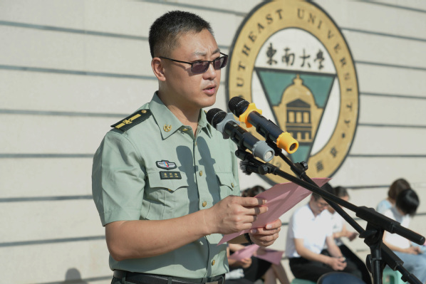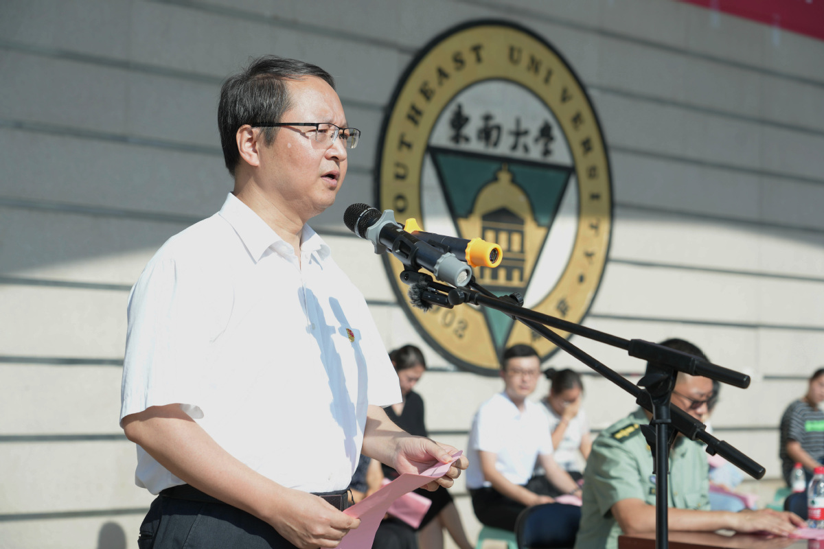 学校党委书记张志胜发表总结讲话。张书记首先代表学校党政向73211部队的领导与承训教官、辅导员与协助开展军训工作的相关部门、2023级的全体新生们表达诚挚感谢,同时他向2023级学生提出几点建议与希望:一是要居安思危,心怀家国之情。要充分认识到新时代国防教育的重大意义,强化国家安全意识,凝聚思想共识、增进行动自觉,自觉涵养“胸怀祖国、心忧天下”的家国情怀;二是要志存高远,懂得感恩传承。要有为国求学的志向,要有报国奉献的理想,懂得感恩父母、感恩社会,把军训中练就的不怕苦、不怕累的精神融入今后的学习生活中,把军训成果内化为今后待人处事的道德规范,志存高远、敢于担当、善于作为;三是要珍惜时光,秉承止于至善精神。各位同学在今后四年的学习生活中,要秉承东南大学止于至善校训精神,自觉锤炼品德修为,脚踏实地,培养自己独立思考和解决问题的能力,积极参加校内外各类学科竞赛、文化活动、创新实践等,坚持文化自信,努力把自己塑造成为有文化、有理想、有担当的新时代青年。