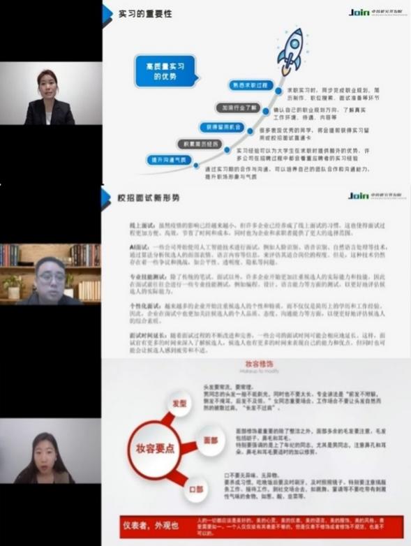训练营线上直播总观看数750人/次、互动百余次,为同学们讲述了2023年校招形势变化、如何做好就业考公(考研) 双保险、自我介绍的黄金法则、毕业生求职必备礼仪等。同学们积极参与,通过直播课的形式与老师交流、分享自己在求职过程中遇到的困惑。