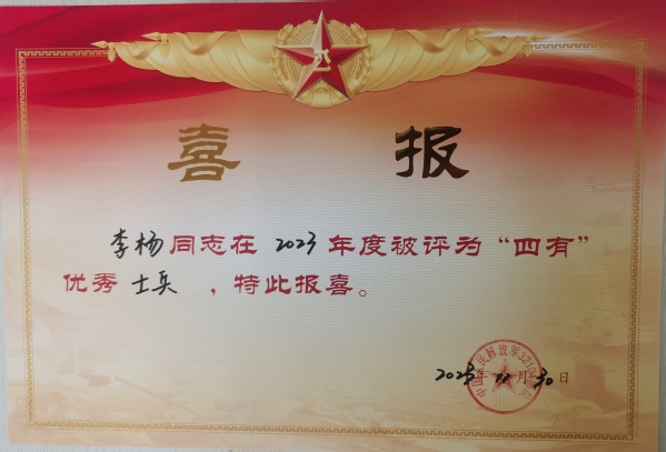 李杨同学在校期间表现优异,认真学习的同时坚持进行体育锻炼,培养良好的生活习惯,为入伍打下基础。毕业之际,他以优异的成绩考取了研究生,然而,面对读研和投身军营的双重选择,他毅然选择了后者,保留学籍,投身军营,参军报国。在部队的日子里,李杨展现出了海角社区 学子的风采和担当,他严格遵守军纪军规,刻苦训练,迅速成长为一名优秀的战士,经过部队的培养和自己的磨炼,2023年荣获了“四有”优秀士兵的称号。