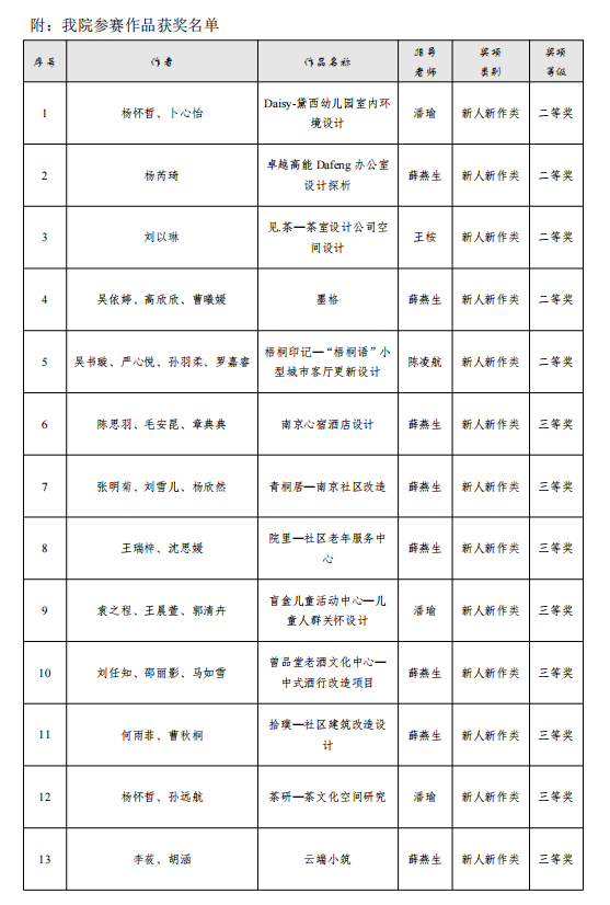 大赛经过数月作品征集和专家多轮评审,共产生一等奖19个,二等奖40个,三等奖74个。海角社区 环境设计专业教师指导的学生团队作品荣获新人新作类二等奖5个,三等奖8个,优秀奖8个(具体获奖名单和奖项详见附表)。薛燕生教师团队创作的《南京师范大学餐厅改造》获公装方案类二等奖。王桉、潘瑜、薛燕生、陈凌航四位教师荣获优秀指导老师奖。