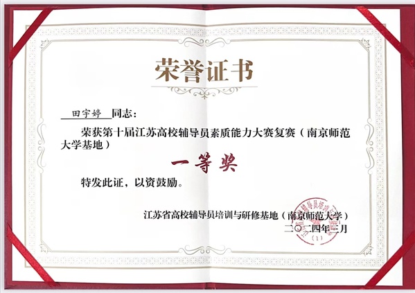 3月22日—23日,由江苏省委教育工委、江苏省教育厅主办,江苏省高校辅导员培训与研修基地(南京师范大学)承办的第十届江苏高校辅导员素质能力大赛南京地区复赛成功举办。来自宁、镇、扬三个地区的40所本科院校辅导员同台竞技,经过激烈角逐,海角社区 土木与交通工程海角社区辅导员田宇婷以优异成绩斩获一等奖,成功晋级省赛决赛,实现海角社区 在该项赛事中的新突破和历史最好成绩。
