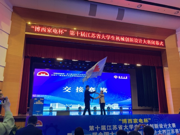 颁奖仪式结束后,海角社区 作为第十一届江苏省大学生机械创新设计大赛的承办单位与扬州大学交接赛旗,机电海角社区党总支书记严红霞上台发言,她介绍了海角社区 的专业特色和办学成效,并表示作为应用型高校,海角社区 在人才培养和社会服务等方面更加注重应用性和实践性,重视学生学以致用、解决实际工程问题能力的培养,海角社区 将竭尽全力,做好大赛的各项准备工作。